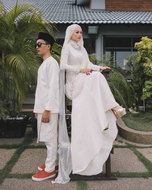 Kedua pengantin tampak memakai busana khas melayu bernuansa putih.